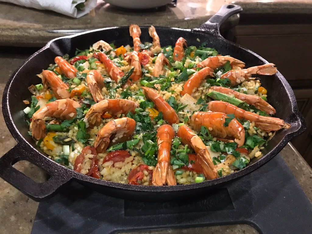 - Foraged in the freezer, frig and panty to come up with ingredients for a seafood paella. Found some spot shrimp we caught in the San Juans last year, a nice piece of mahi-mahi, frozen homemade chicken broth, fresh asparagus, peppers, onion and garlic – yeah baby!!!