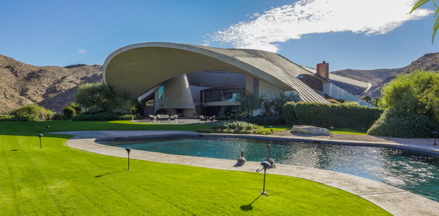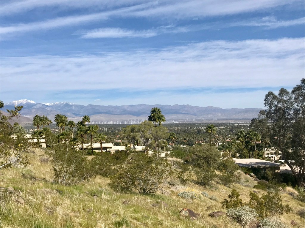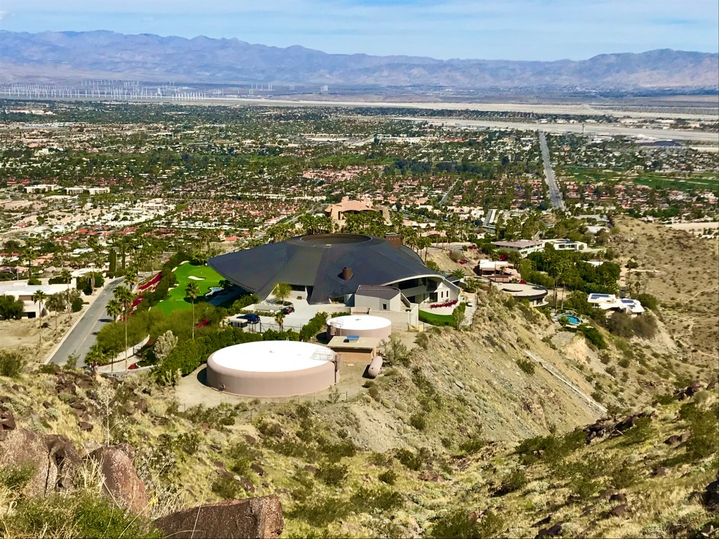 - Hiked the Araby Trail with friends Katie and Dean today. This heavily trafficked out and back trail took these hikers up a 900 ft elevation gain less than half way through the 3 mile hike. Yep, I was sweating and huffing a bit but the payoff was great views of the valley and a chance to check out the house built for Bob Hope in 1979. This 23,000-square-foot house is legendary for its unusual design and it is certainly is a architecture marvel. The vast copper roof slopes upward from three points to meet at a crater-like circular skylight opening over the home’s spacious interior terrace. Wedged between each of the three slopes is a massive rounded concrete shell-like arch hanging over the home’s three entrances and patios, each with enormous glass windows that provide spectacular views of the Coachella Valley, city of Palm Springs, and San Jacinto Mountains.