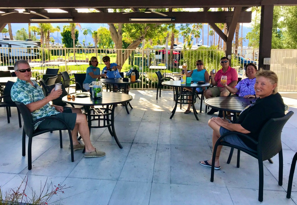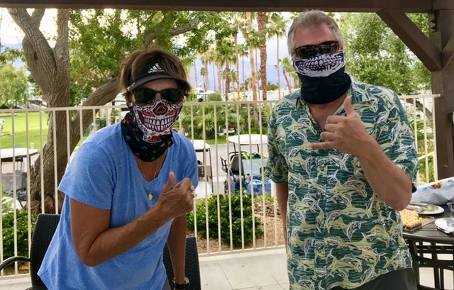 - Joined in the fun at the first meeting of the Quarantini Club…Four couples from our “compound” met at the pool pergola for drinks and snackies. Each couple sat at a different table at least 6 feet apart. It was a fun first meeting and we all gotta thank Cindy for providing the buffs to help keep everyone safe!