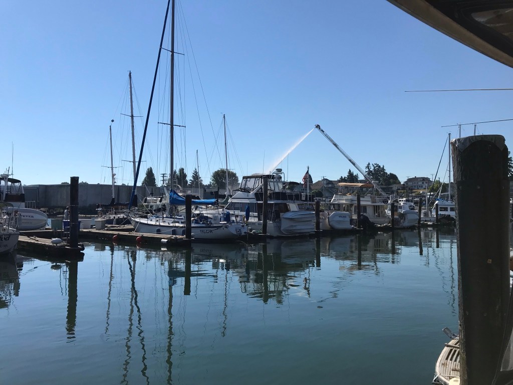 The other big excitement that happened this summer was the fire in an abandon building next to our marina. This mysterious fire broke out at 1 am and engulfed the old, decrepit, rat infested building quickly. Bentley was our smoke alarm, he woke Wally up when he smelled the smoke and was insistent that Wally get up, even after being told to go back to bed. Some how I slept through the whole damn thing, but woke up to the over powering smell of smoke and charred wood. After jumping out of bed and looking around, Wally sleepily told me the building burned down. HUH…by the time I got up, the building was a smoldering pile. The fire department was there for over 10 hours making sure there were no hot spots remaining. Despite our close proximity, our marina wasn’t damaged. Had there been wind, our old wood structures would have been at great risk. Guess we can thank the arsonist for at least choosing a calm, windless night.