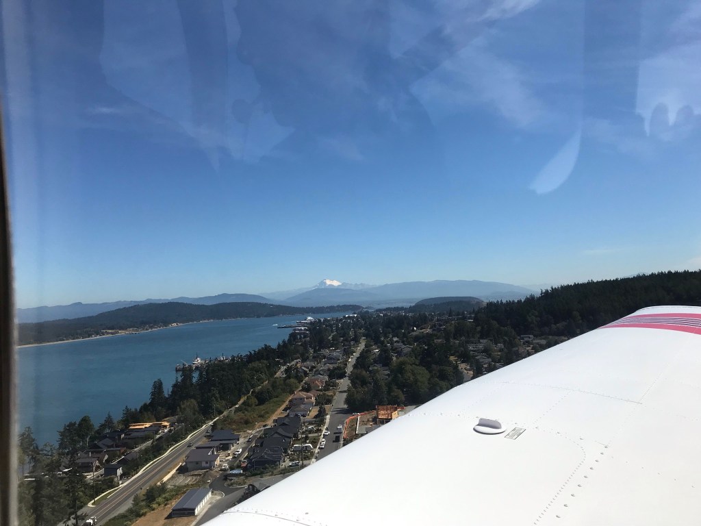 One highlight was taking a flight around the San Juan Islands with our friends John and Kristen. They flew their Piper Warrior – Valentina to Anacortes from Newport, Oregon to meet up with a gang of us from our winter playground in Palm Springs. John is a great pilot and we have flown with him and Kristen several times. Wally especially loves it as he has a tiny bit of experience flying so it is alot of fun when John lets him take over the controls.