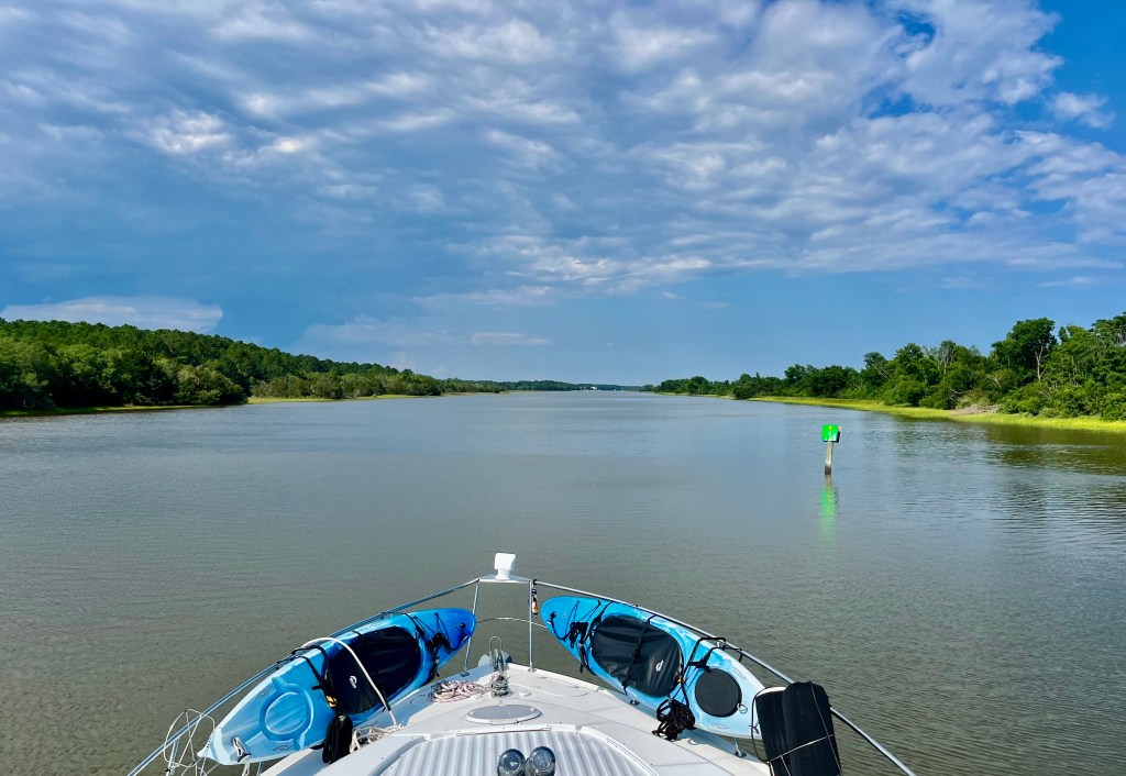 We picked up our long time friends and fellow travelers, Dave and Tanya in New Bern on the 17th of June. They will to cruise with us to Norfolk – YAY!!! The four of us have traveled all over the world together and they have been on all of our boats over the years. We also all really enjoy good wine and food, cooking or dining out and are completely compatible in small space. Dave and I love getting in the kitchen together and crafting up a great meal. It’s so wonderful to have them onboard and we really thrilled that they are part of our Great loop Adventure.