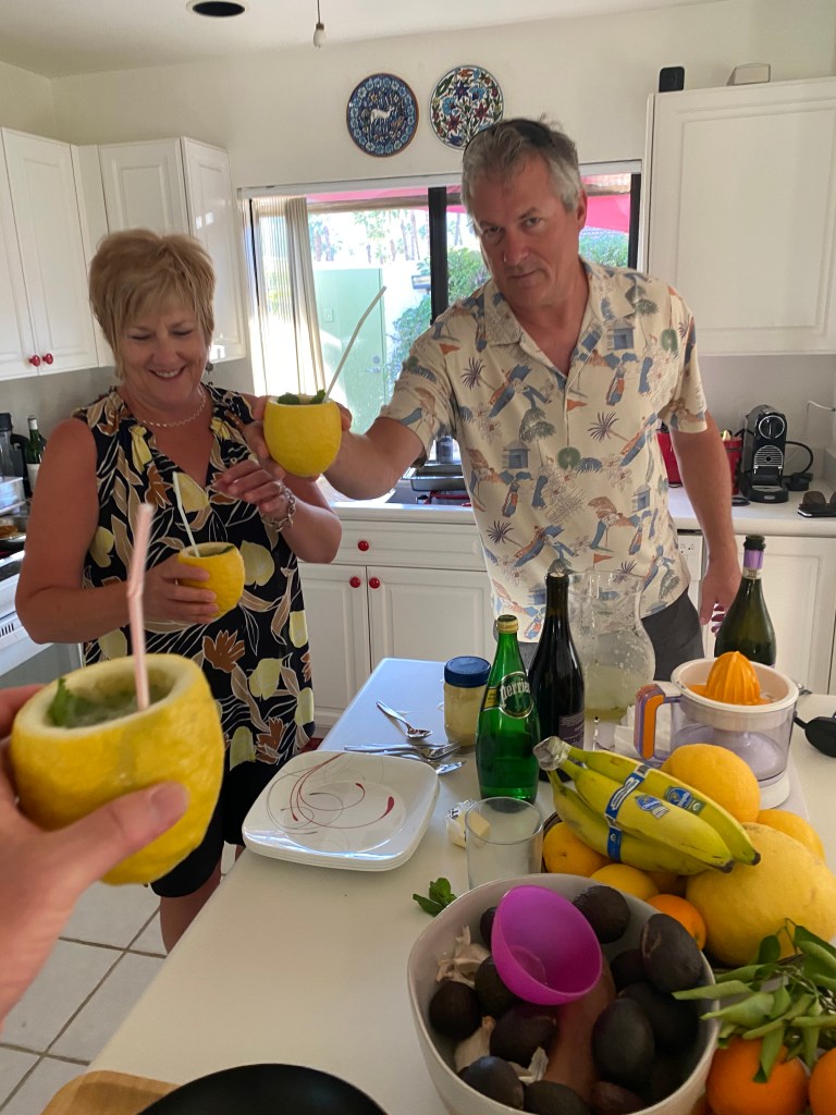 - Monday, we spent the evening with our other SIP friends in Palm Springs. They graciously offered a home for the geranium pots so we took them over and Wally aka Mr. Handy Pants installed a drip watering system that connects to their existing sprinkler system. It was international night so we all took a trip to Morocco… it is not what you are thinking, no huka pipe…the incredible meal was all moroccan dishes! Thank you Mike and Nanette for a wonderful time!